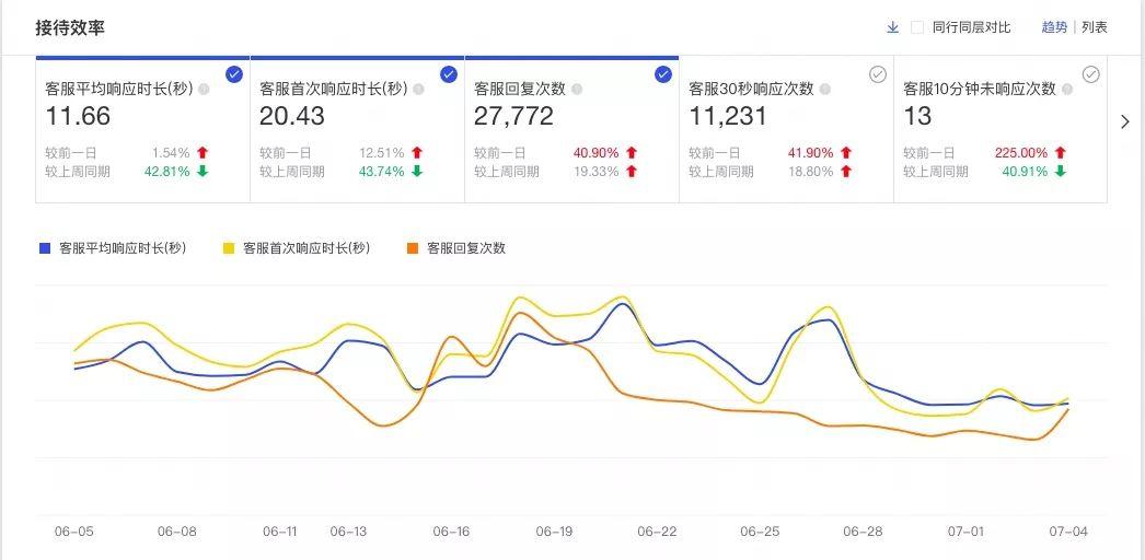 它反映了接待能力的访客数、咨询客服人数、客服咨询率、咨询客服人次、客服回复人次、客服询单人数等;反映接待效率的客服平均响应时长、客服首次响应时长、客服回复次数等;反映贡献转化的客服支付金额、客服支付买家数、客服询单-下单转化率、客服询单-支付转化率等。