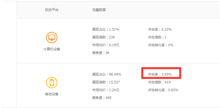 3·根据我们推广词的地域来优化,也可以提升点击率,比如说你推广“破洞牛仔裤”你就去流量解析,打开这个词的竞争分析,市场平均点击是3.93对吧