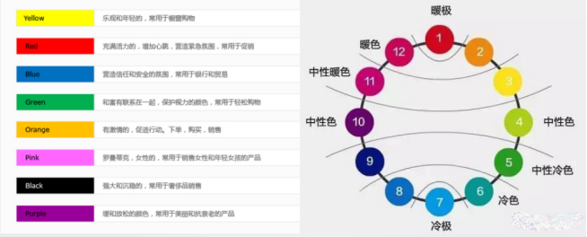 色彩是最给力的设计手段之一,不同的颜色对产品不同的情感影响,所以色彩在使用时要有目的性和引导性。色彩可以简单分为三种,冷色,暖色,中性色,在页面制作之前首先需要确定主色,以及辅色。先来基本认知一下色彩。一下就是几种常见的颜色